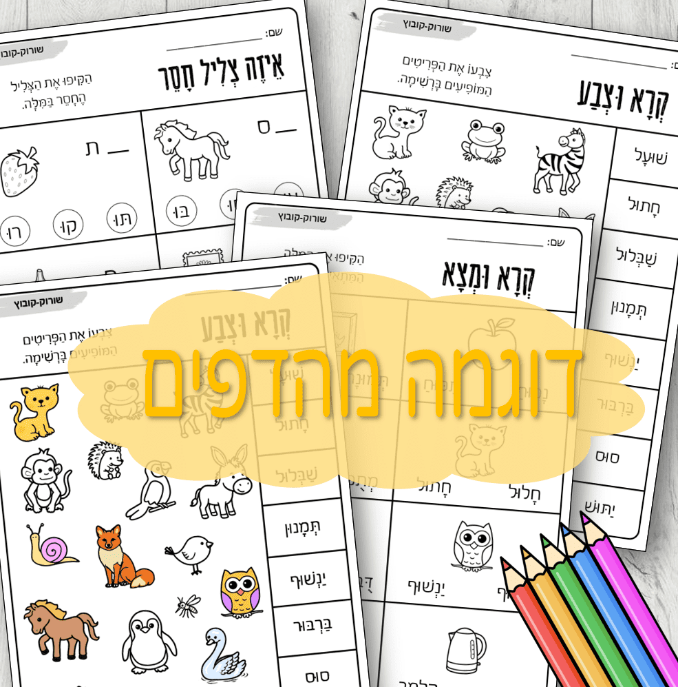 - 5 דפי קריאה – קריאת מילים עם שורוק-קובוץ וצביעת ציורי המילים בתוך תפזורת.